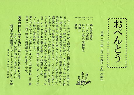 ◆障害者施設、地域作業所の食事作り◆ 平成8年(1996年)より、横浜市中区にある障害者のかたが活動する地域作業所で昼食作りをしています。 ごはん ごはん 茹で豚の胡麻ソース 鰆の菜種焼き 新じゃがの煮物 ふろふき大根 ちくわと青菜の和え物 金時豆の煮物 春キャベツの浅漬け 青菜ときのこの胡麻和え ある日の表紙 お弁当には、毎回その日の献立と季節の話題や出来事などを書き添えた表紙をつけてお届けしています。